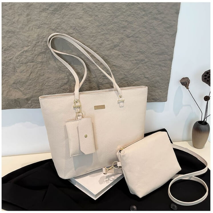 This 3 piece tote bag includes a spacious main tote, detachable crossbody pouch, and mini cardholder. Soft lining, magnetic closure, and reinforced base keep essentials safe while the neutral palette pairs with any look.