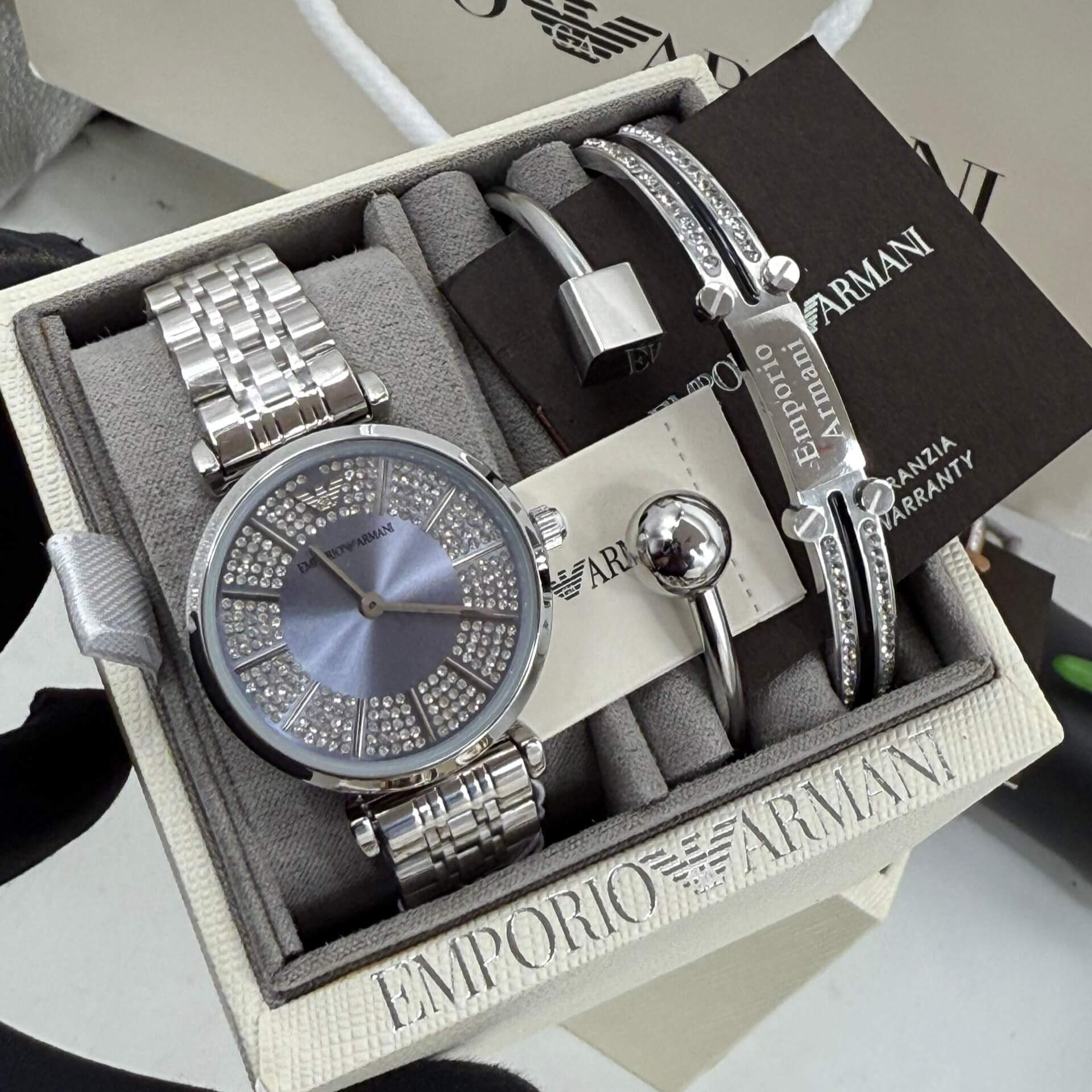 Armani silver blue crystal set enchants with a cool blue crystal pavé dial on a polished silver bracelet the perfect fusion of sparkle and sophistication for gifting or personal luxury. This silver blue set includes the stainless steel watch with shimmering blue dial, paired with a crystal bangle and padlock charm bracelet. Quartz precision, subtle water resistance, and icy blue radiance make this collection irresistible.