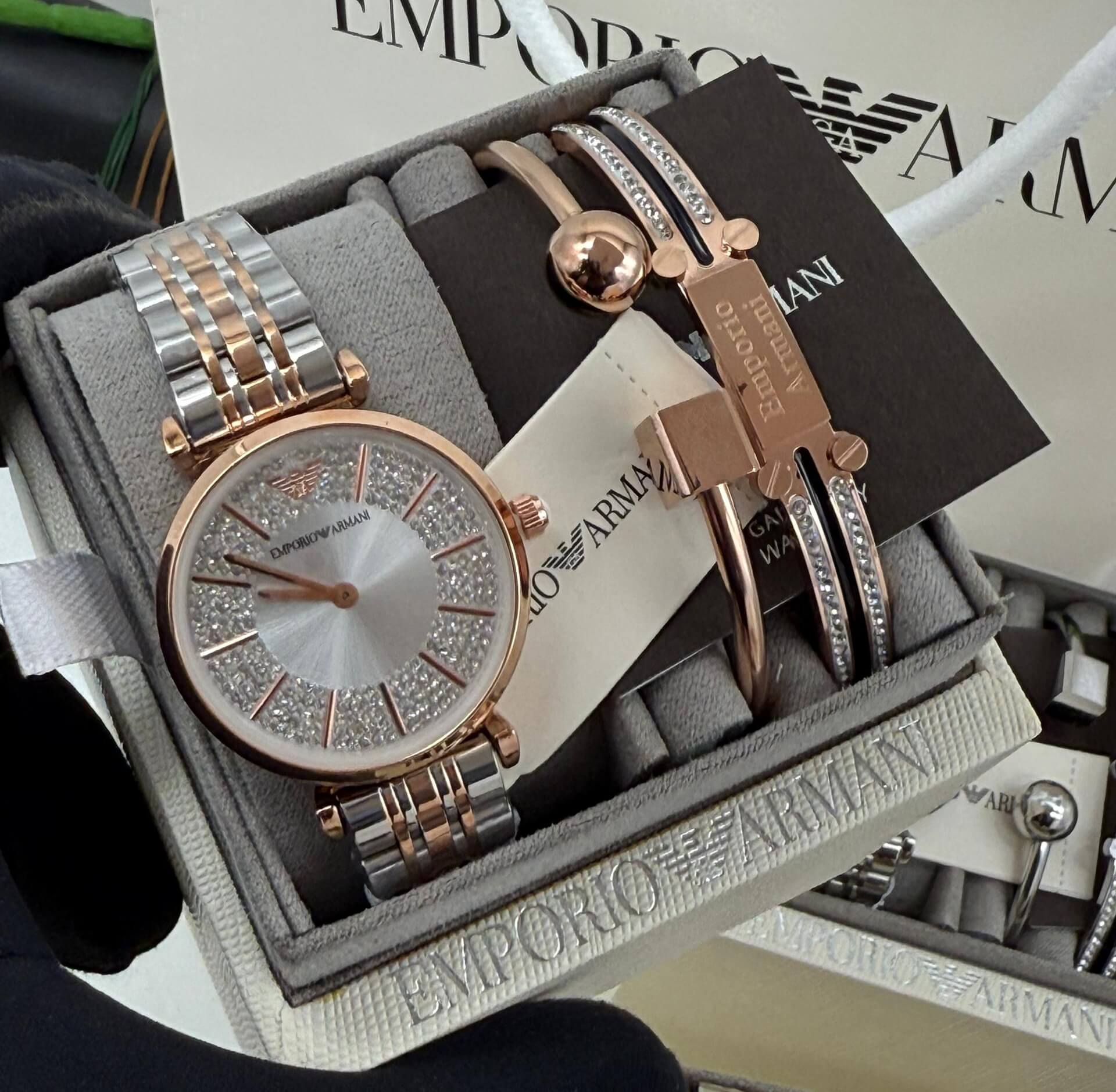 Armani two tone crystal set blends timeless luxury with a crystal pavé dial on a two-tone bracelet perfect for gifting, owambe, or everyday glamour. This armani crystal set includes the stainless steel watch with sparkling crystal dial, plus rose gold crystal bangle and padlock charm bracelet. Quartz movement, subtle water resistance, and elegant two-tone finish. Moreover, crystals dazzle with every movement. Additionally, secure clasp ensures comfortable wear. Furthermore, arrives in premium packaging with warranty. In addition, free shipping on 2+ sets. For example, layer for red-carpet shine or wear solo for refined sophistication. Now only ₦85,000.