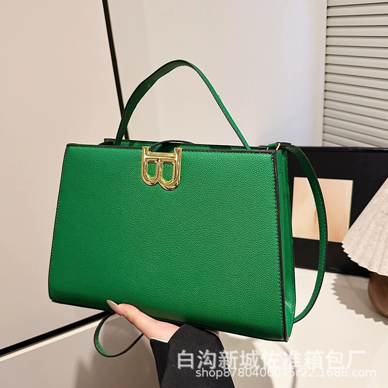 This b logo handbag features a structured rectangular silhouette, dual carry options via top handle or detachable strap, and a clean flap closure.
