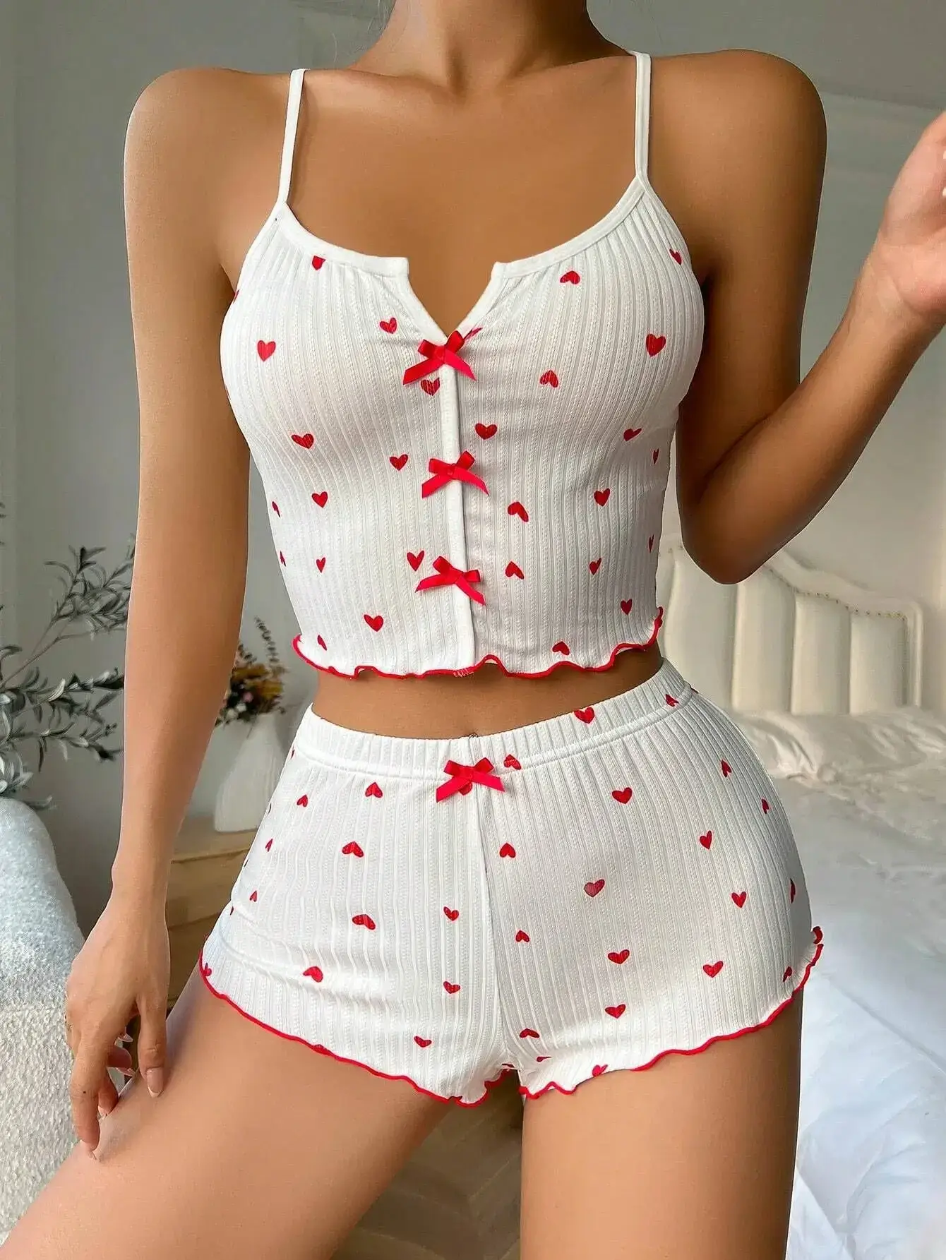 Flirty Design Meets Everyday Comfort The playful heart print adds a romantic touch without being suggestive. Thin, breathable knit fabric keeps you cool all summer. Short sleeves (4–16 inches) and elastic-waist shorts ensure a perfect fit. Machine-washable and quick-drying, it stays fresh wash after wash.