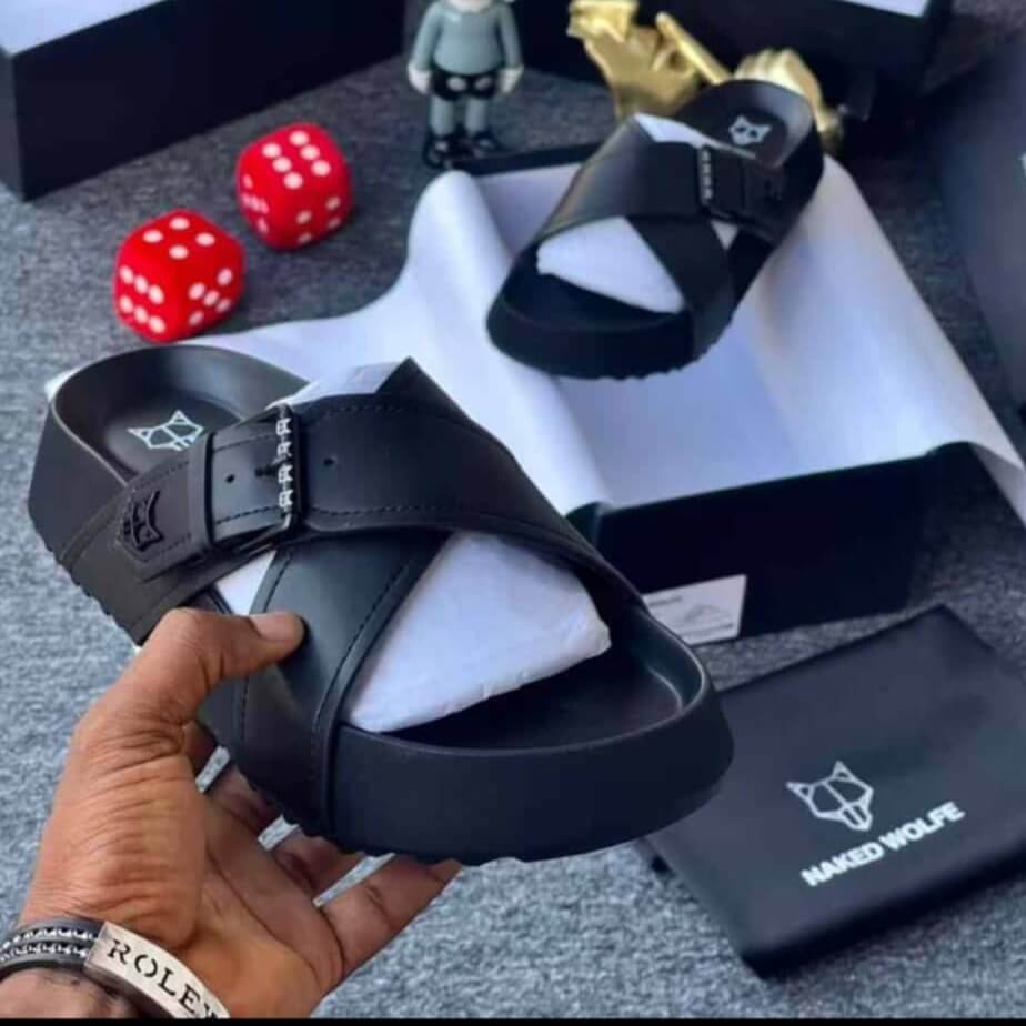 Naked wolfe platform slides deliver chunky luxury with crisscross straps and silver wolf buckle perfect for streetwear kings, owambe, or bold casual looks. These naked wolfe platform slides feature thick 5cm platform sole, padded footbed, and anti-slip rubber for all-day comfort and height. Premium leather-look upper with signature branding.