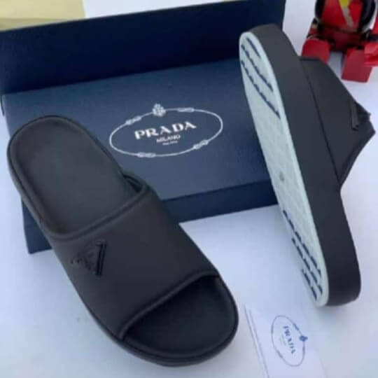 Prada logo slides deliver Italian luxury in molded rubber with embossed triangle logo perfect for owambe, poolside, or daily flex.