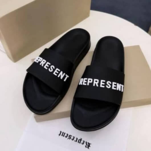 Represent logo slides deliver premium rubber comfort with bold white branding perfect for casual flex, poolside, or streetwear.