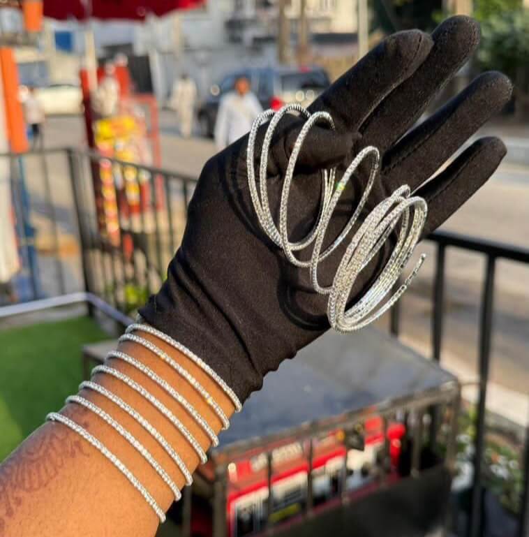 Imagine stacking these on your wrist: the tight spiral shape gives a sleek, modern twist, while the continuous row of brilliant crystals creates a dazzling, diamond-like effect that elevates simple kurtis, sarees, lehengas, or even Western dresses. Open-ended with smooth tips for easy on/off, they’re adjustable, super lightweight, and perfect for layering. Great for weddings, parties, festivals, or daily wear when you want that subtle luxury glow — the silver plating holds up nicely with care, and the crystals add timeless sparkle without feeling heavy.